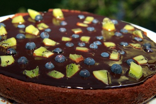 Það eru bara tveir ókostir og þá er ég ekki beinlínis að vísa í sjálfa kökuna. Annað er að nafnið „fudge“ er bara ekki til í íslensku, hvað er málið með það?! Fudge er einhverskonar mjúk súkkulaðikaramella en mér finnst sú skýring ekki jafn lýsandi og orðið „fudge“. Ég skrifaði einmitt um þetta karamelluvandamál í íslenskunni í þessari færslu um banana-karamellubökuna (ef þið hafið ekki prófað hana enn þá eruð þið að missa af miklu! 🙂 ). Hitt vandamálið fer nú samt meira í taugarnar á mér! Í gær var ég með matarboð og um daginn var ég að laga til og undirbúa boðið. Ég tók rafhlöðuna úr myndavélinni minni og ætlaði að setja það í hleðslu. Samtímis var ég að gera hundrað aðra hluti eins og okkur konum er einum lagið. Þegar ég ætlaði að smella rafhlöðunni í hleðslutækið var ég skyndilega ekki lengur með það í hendinni. Til að gera langa sögu stutta þá finn ég ekki rafhlöðuna! Ég er búin að leita út um allt, líka í ruslinu, en rafhlaðan finnst hvergi! Ég þurfti því að taka myndir á litlu myndavélina mína. Ég var alveg viss um að þær myndir myndu ekki gera kökunni nógu góð skil. En ég tók nokkrar myndir í dag (átti smá afgang af kökunni) í dagsbirtunni og ég verð að segja að Canon Powershot vélin er nú alveg ótrúlega góð miðað við að þetta sé bara lítil sjálfvirk vél. Ég læt allavega þessar myndir alveg flakka og held áfram að leita að þessari blessuðu rafhlöðu! Í gærkvöldi þegar ég bauð kökuna var hún bara búin að bíða í ísskáp í um það bil þrjá tíma. Þá var kremið ekki alveg harðnað og hún leit svona út.