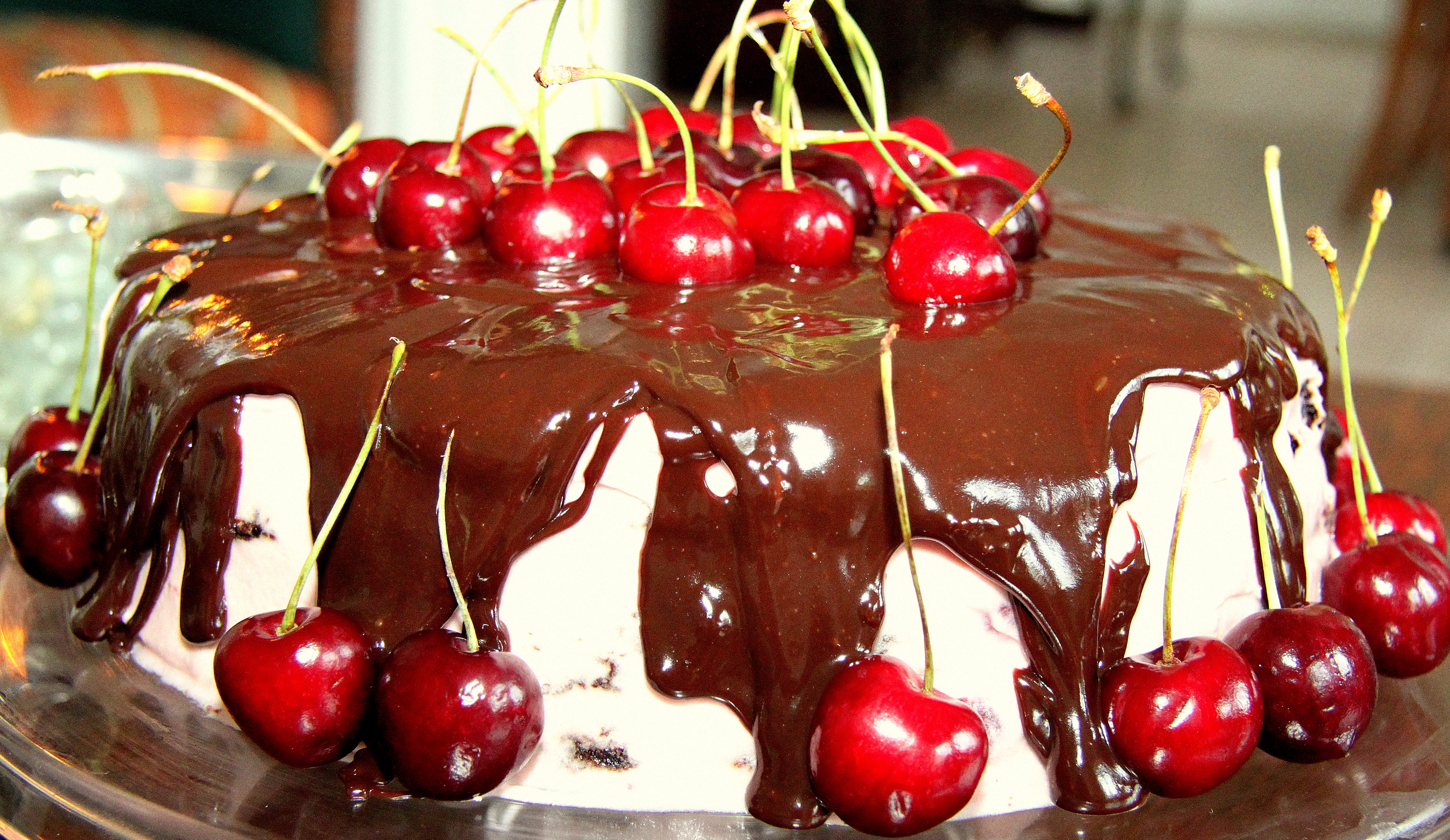 Þessa mynd tók ég fyrir um það bil ári síðan þegar ég gerði þessa dásamlegu kirsuberjatertu í fyrsta sinn og tók hana með til góðra vina í Grjótaþorpinu. Ég hafði séð upppskriftina á ýmsum sænskum matarbloggum og gat ekki annað en prófað. Síðan þá hef ég gert þessa tertu nokkrum sinnum, breytt og aðlagað uppskriftina og núna er þetta ein af mínum uppáhaldstertum.  Það er mikilvægt að gera tertuna deginum áður og leyfa henni að brjóta sig í kæli yfir nóttu áður en hún er borin fram. Botnarnir verða þá blautir, eiginlega eins og súkkulaðifrauð eða búðingur sem er einstaklega ljúffengt í bland við gómsæta kirsuberjakremið! Í uppskriftinni er mascarpone ostur en ég hef líka notað rjómaost og mér finnst það alveg jafn gott. Kirsuber fást yfirleitt aldrei á veturnar og þá er hægt að skreyta tertuna með öðrum berjum. En núna eru kirsuber til í mörgum verslunum þannig að það er ákkurat rétti tíminn til að prófa þessa dásemd! Það tekur dálítin tíma að gera tertuna þar sem að það þarf að baka þrjá botna og búa til tvenns konar krem. En ég get lofað að það er þess virði! 🙂
