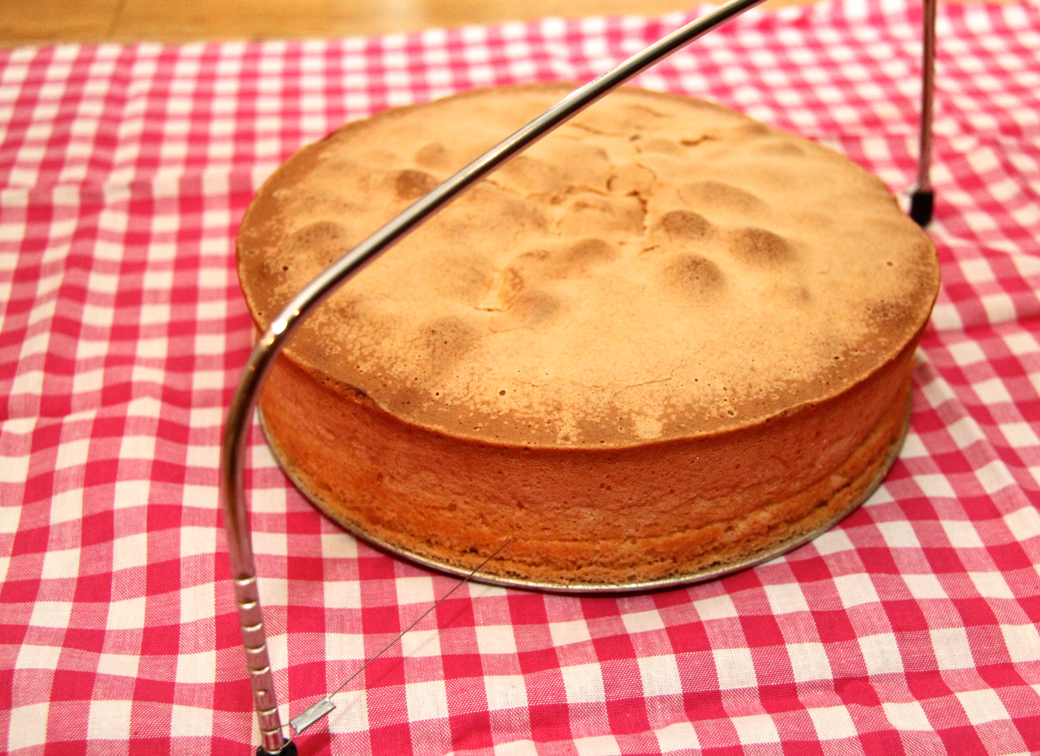 Þegar hindberin hafa þiðnað eru þau maukuð saman með gaffli (hægt að bæta við 1 tsk af sykri). Gott er að sía frá svolítið af vökvanum þannig að kökubotninn verði ekki alltof blautur undan hindberjamaukinu. Svampkökubotninn er skorinn í þrennt. Ég nota svona sniðuga græju frá Íkea til þess að skurðurinn verði jafn:
