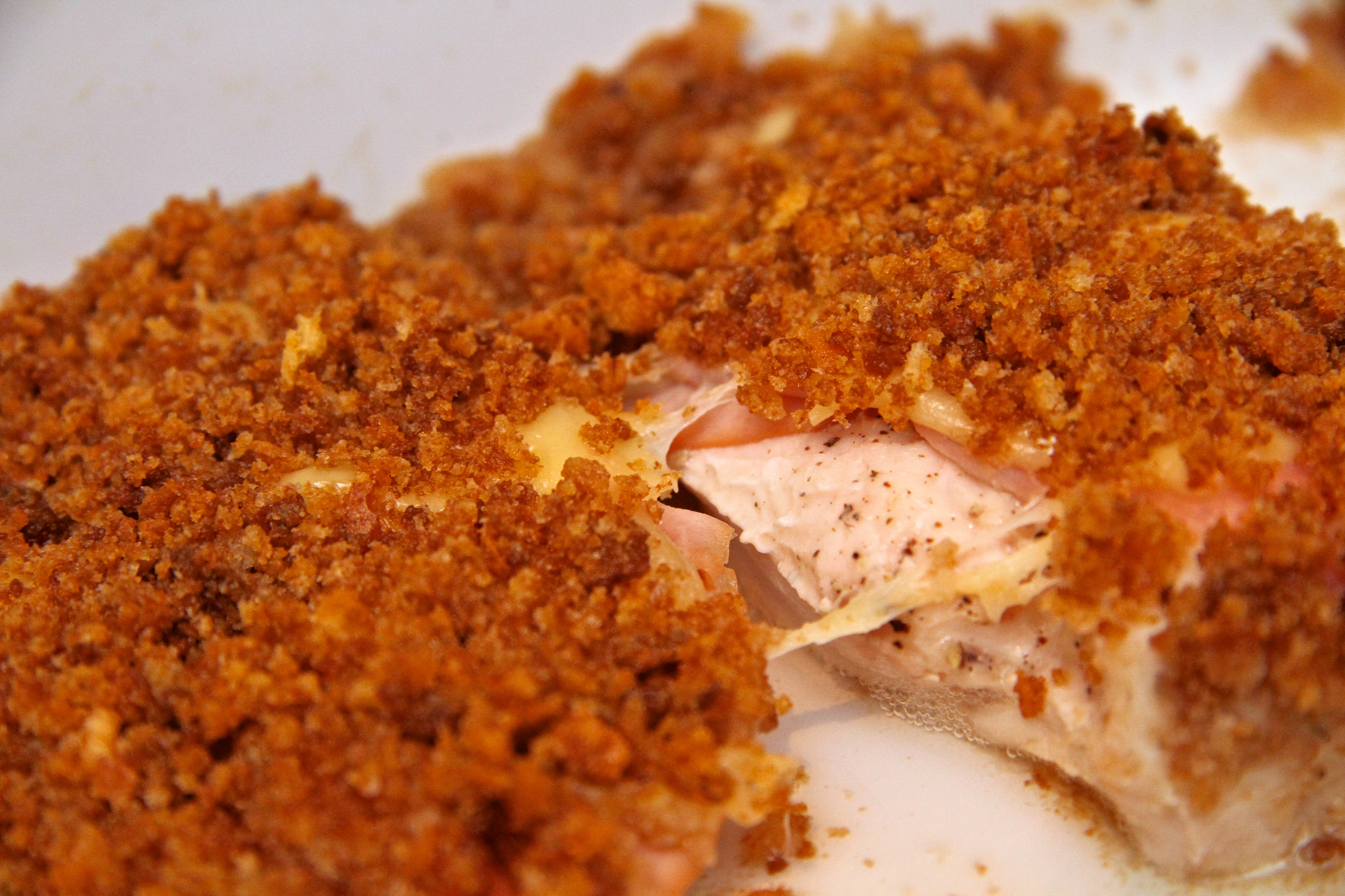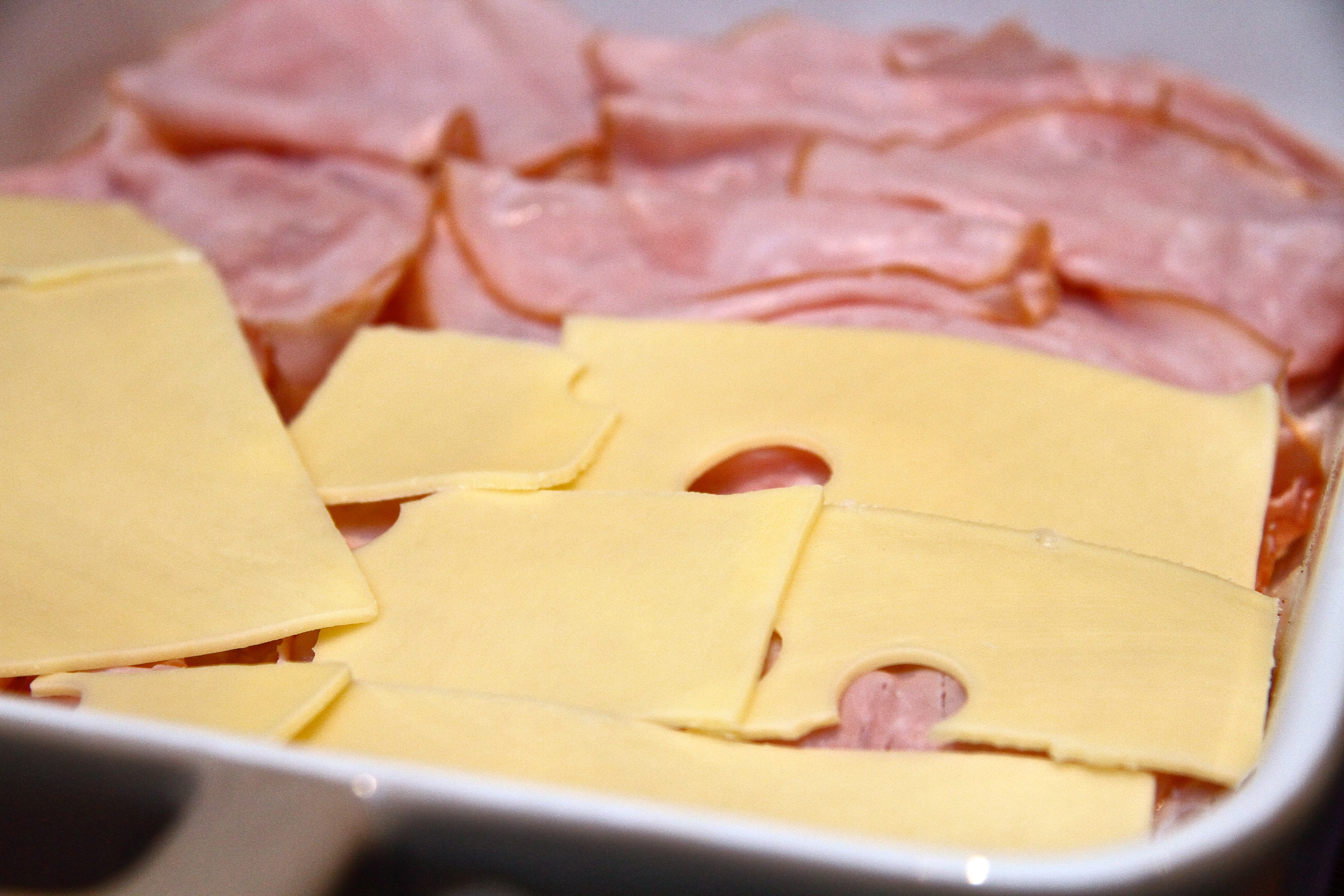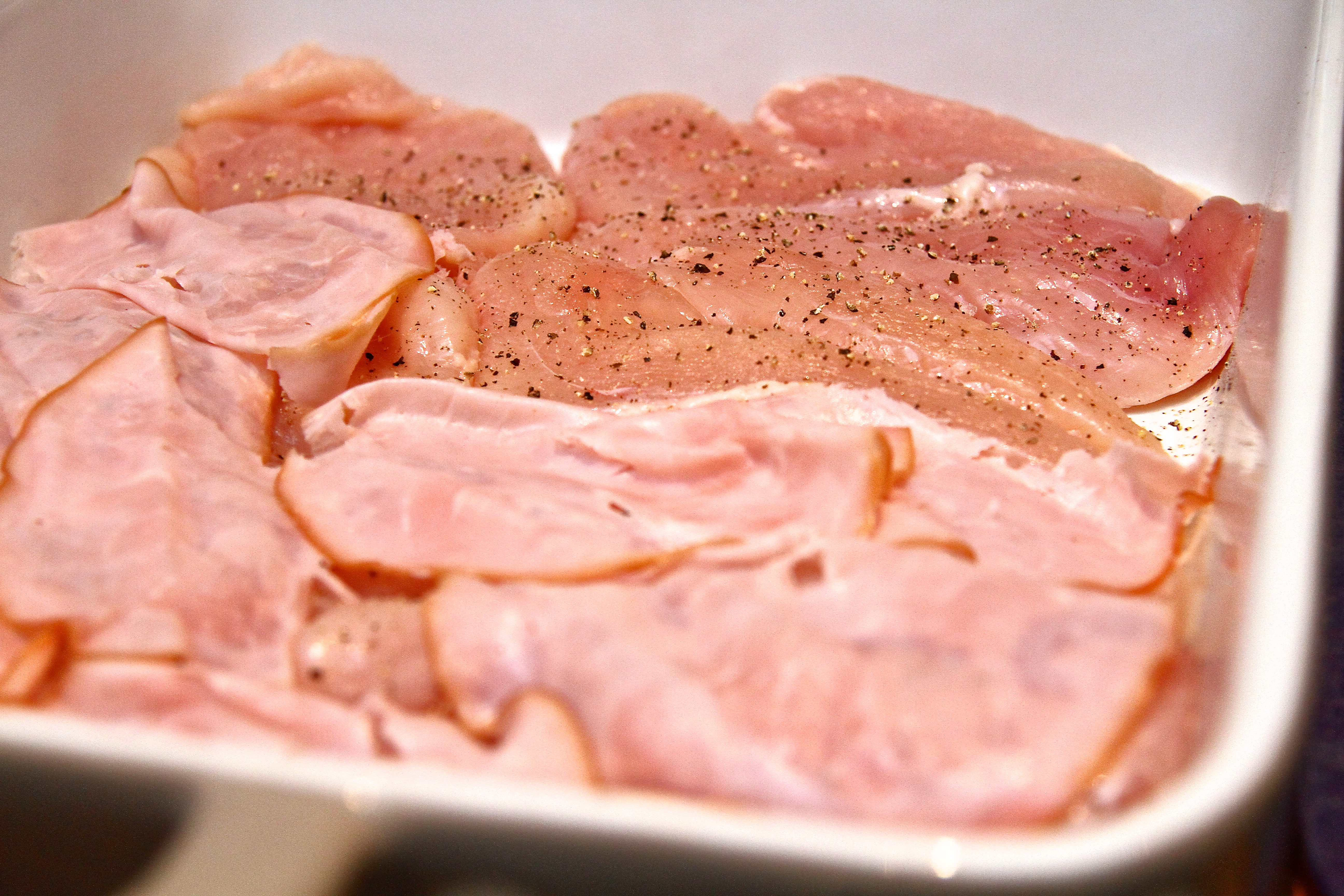 Ofn hitaður í 180 gráður. Eldfast mót smurt að innan. Kjúklingabringurnar skornar í tvennt langsum, þess gætt að hver bitarnir verði jafnþykkir, þannig að úr verði 10 bitar. Kjúklingurinn er saltaður og pipraður og raðað í eldfasta mótið. Hver bringa er þakin með skinku og þá osti.